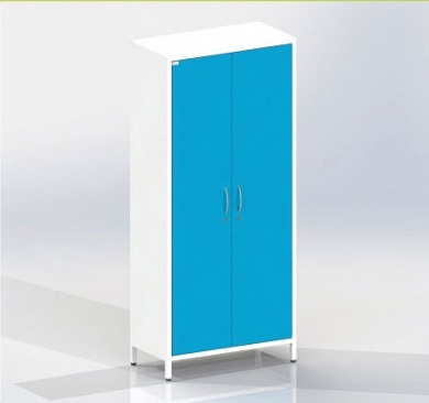 Шкаф двухстворчатый на ножках с двумя отделениями, с двумя цельными металлическими дверцами с замками,  по четыре полки в каждой секции.