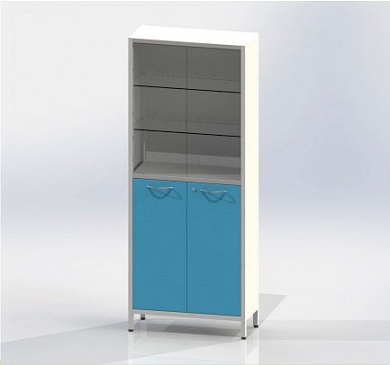 Шкаф двухстворчатый на ножках, верхняя секция с дверцами из стекла и двумя стеклянными полками, нижняя секция с металлическими дверцами с замком и металлической полкой.