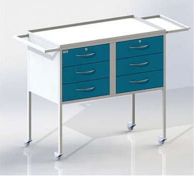 Столик передвижной на колесных опорах диаметром  50 мм,  6 ящиков (два ящика оснащены замками),  столешница из нержавеющей стали (с дополнительной выдвижной полкой).