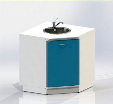 Тумба угловая с дверцей, с вырезом в задней стенке для подвода коммуникаций, оснащена мойкой из нержавеющей стали, локтевым смесителем, сифоном.